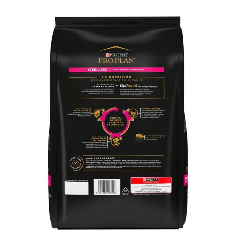 La alimentación es muy importante en cada etapa de la vida de un gato, especialmente si pasan por un proceso de esterilización o castración. Especialmente para ellos, se desarrolló Purina Pro Plan Gato Sterilized, Alimento Seco OptiRenal , una tecnología exclusiva con una mezcla de nutrientes que ayudan a mantener un funcionamiento renal óptimo. Con la tecnología de vanguardia OptiRenal que contiene una mezcla de nutrientes incluyendo antioxidantes, aminoácidos y ácidos grasos omega 3 y 6 que ayudan a mantener un funcionamiento renal óptimo. Con altos niveles de proteína, fibras naturales y niveles reducidos en grasas, ayuda a reducir las calorías y a mantener una condición corporal ideal. Además, estas fibras naturales de la soya y de la celulosa ayudan a controlar la formación de bolas de pelo que se forman en el contenido gástrico por la costumbre natural del gato de lavarse con la lengua. La inclusión de minerales quelatados ayudan a asegurar una óptima absorción y disponibilidad de nutrientes clave para la salud. El alimento está hecho con carne fresca de pollo como fuente de proteína principal y con un balance adecuado de grasas para proveerlo de la energía que necesita.